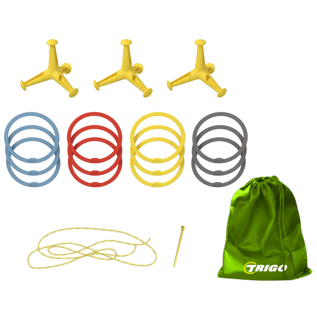 Contient : 12 anneaux au total - 3 de chaque couleur (vert, gris, rouge, jaune), 3 étoiles de Trigo, 3 mètres de ruban de lancer/mesure et une règle de mesure.