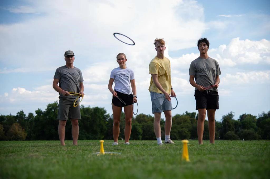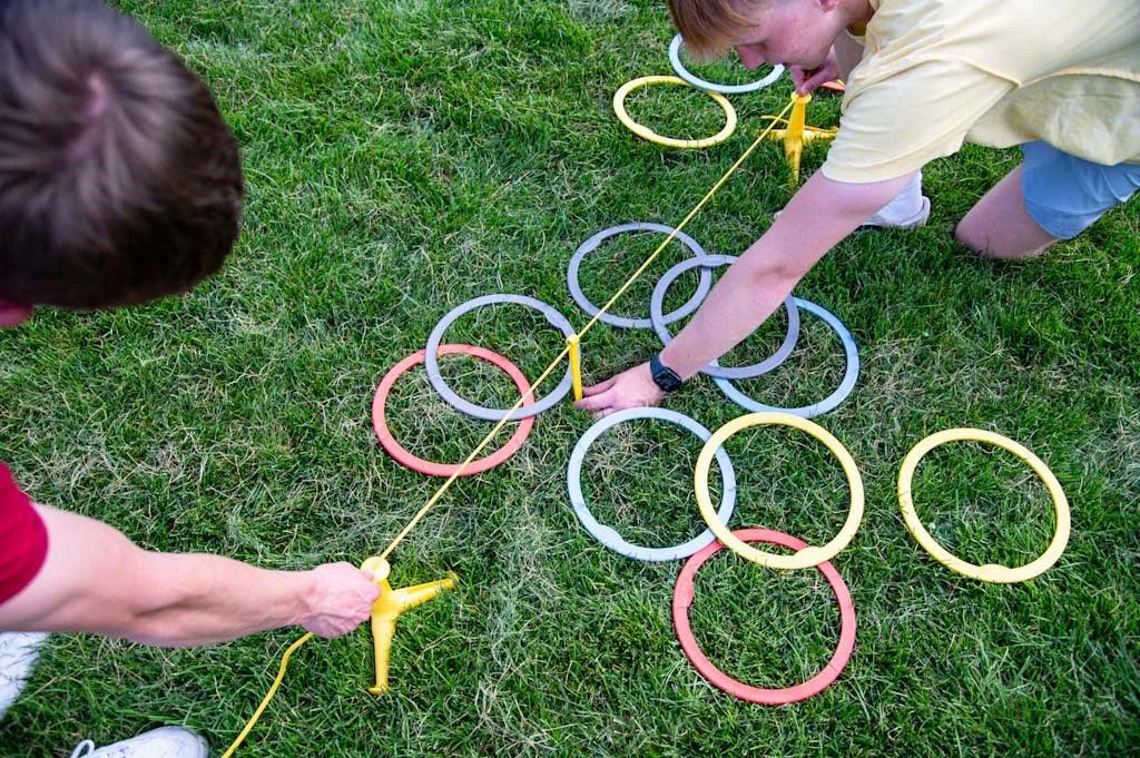 Voici comment on joue : les joueurs placent 3 Trigo Jacks en forme de triangle et visent chaque cible et la case qui en résulte avec leurs anneaux pour marquer des points.