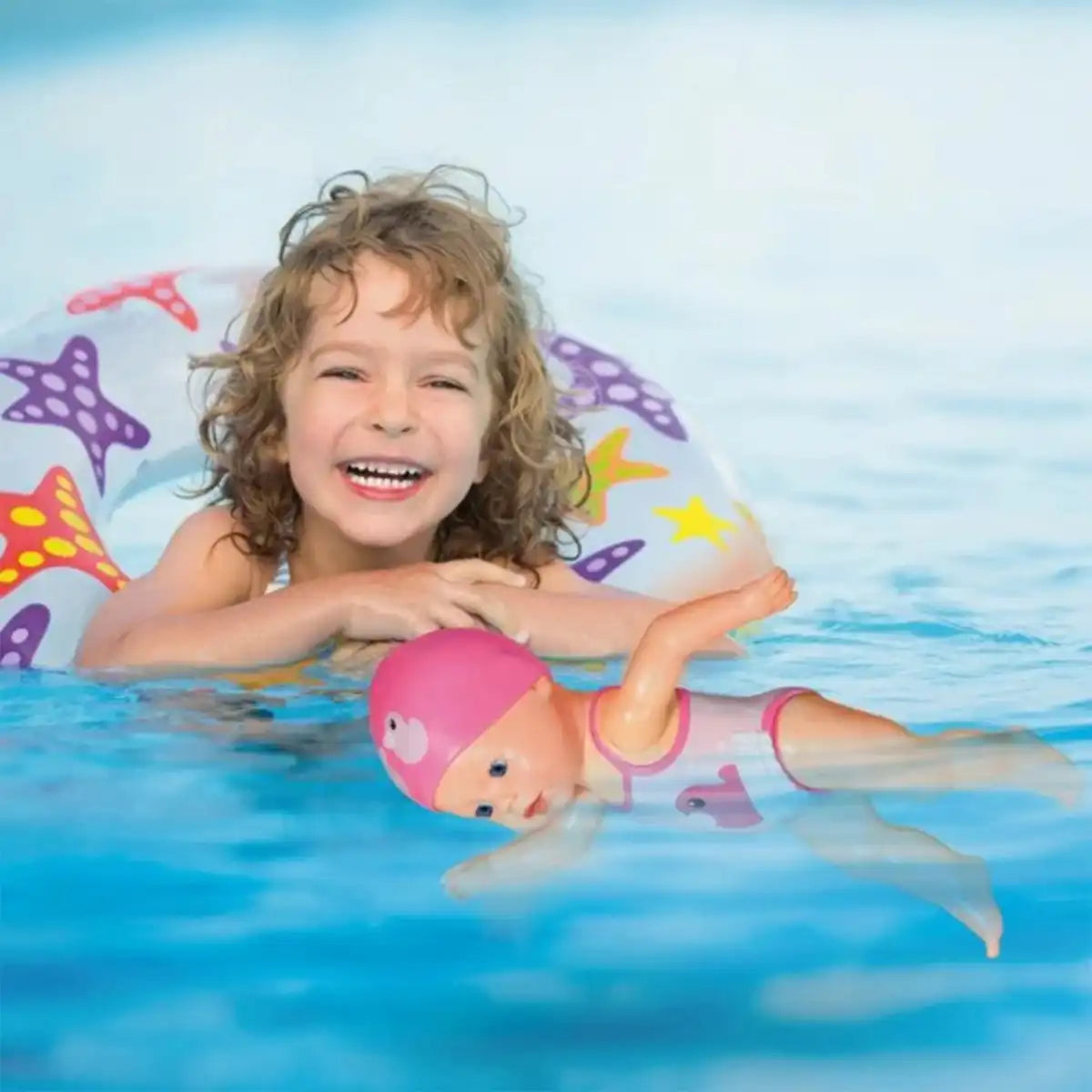 Cette poupée nage comme un dauphin! Ses bras bougent en crawl ou en papillon, sans piles.