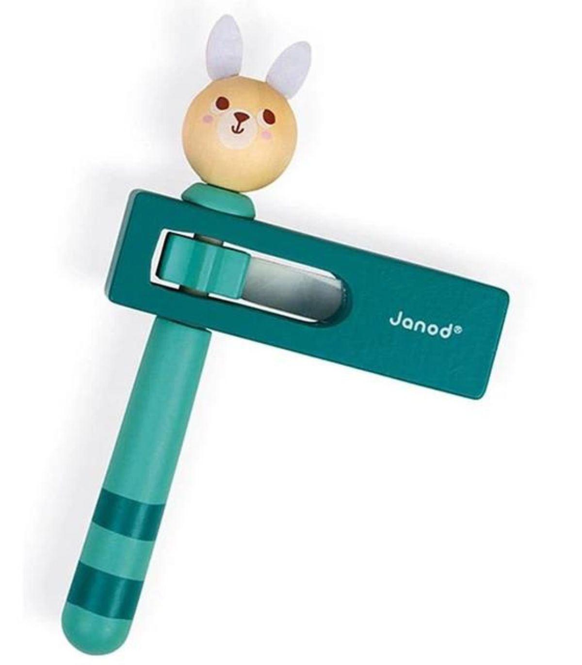 Il suffit de faire tourner la crécelle sur son axe pour entendre le son mécanique produit par la lamelle en plastique. Les oreilles des animaux sont en feutrine.