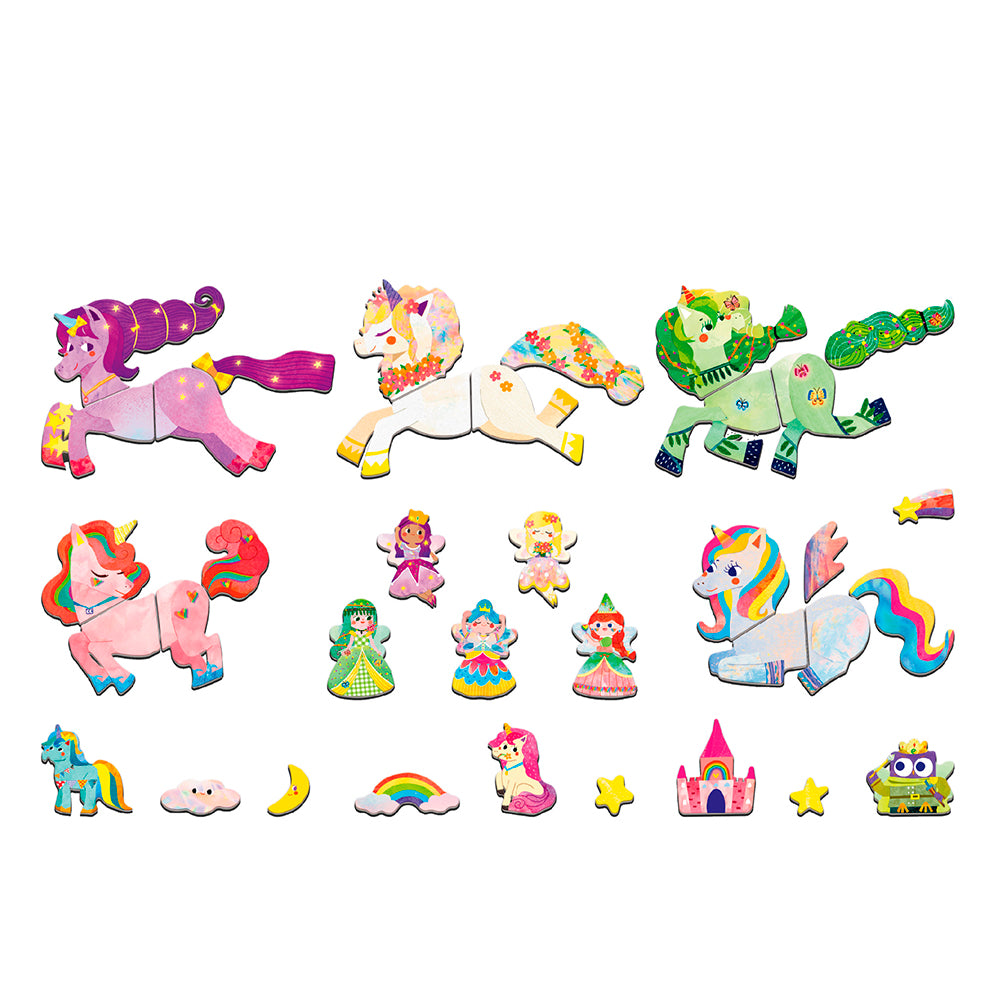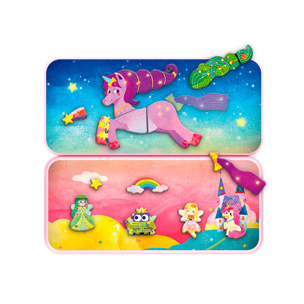 Cette charmante boîte de métal a pour thème les licornes et comprend deux scènes ainsi que plus de 30 pièces magnétiques. En combinant différentes licornes avec des aimants joliment conçus, elle aide les enfants à développer leur imagination, leur concentration et leur coordination œil-main.