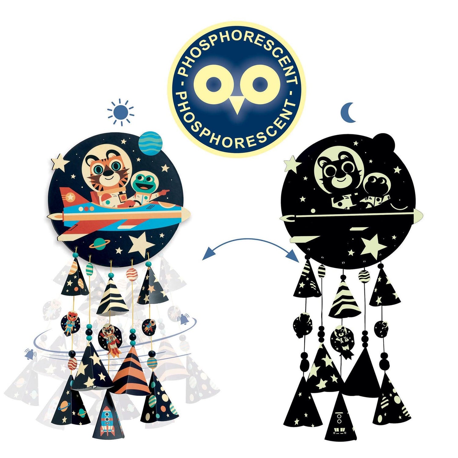 Stars est un carillon phosphorescent à créer sur le thème de l'espace : grelots, perles en bois et cônes illustrés sont à enfiler sur les fils de coton cirés qui s'attachent au support fourni. Quand les fils s'agitent, le carillon tinte agréablement et dans le noir il s'illumine !