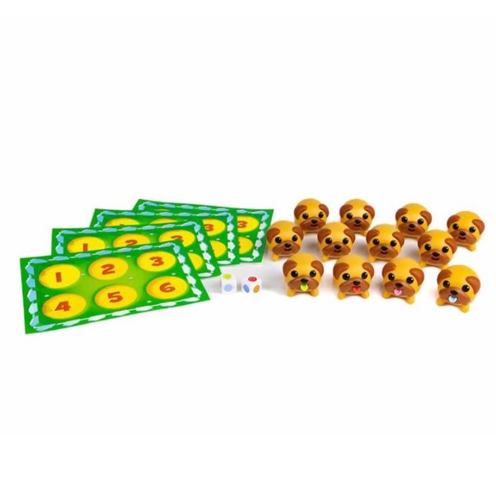 Les chiens ont mangé toutes les sucettes ! Heureusement, leurs langues sont teintées de la couleur de la sucette qu'ils ont eue ! À chaque tour, essaie de faire correspondre deux sucettes sur le dé avec deux chiens tout mous qui, selon toi, les ont léchées ! Lorsque tu serres doucement les petits chiots, leur langue sort ! Aussi mignons que soient ces chiens joufflus, ils ne s'en tireront pas comme ça... Le premier joueur à associer 6 carlins aux couleurs des sucettes gagne la partie !