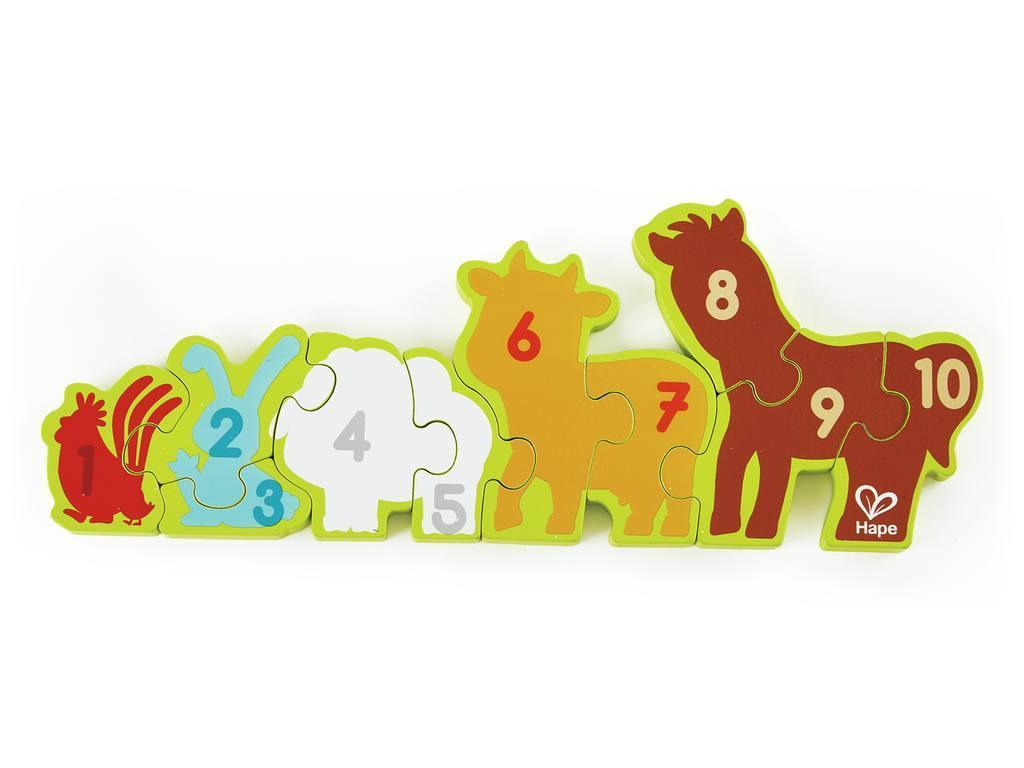The reversible wooden puzzle farm animals and numbers from Hape contains 10 pieces with farm animals on one side and numbers from 1 to 10 on the other. Ideal for beginning to count and recognize farm animals.