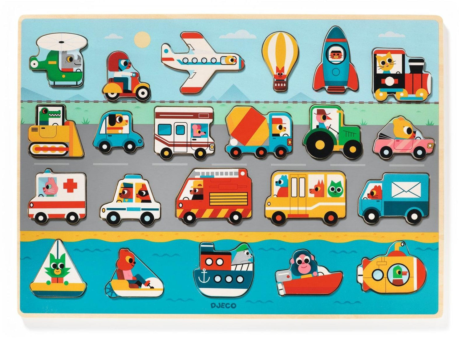 A wooden puzzle on the theme of vehicles. The child places the 22 pieces by recognizing the silhouettes of the vehicles on the board. The colors and silhouettes drawn under the pieces help children find the right piece. Thick pieces, easy to grab.