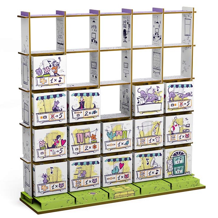 In Balconia, build a building block by block. To score points, optimize the placement of balconies on your side of the building, while avoiding favoring your opponent's balcony.