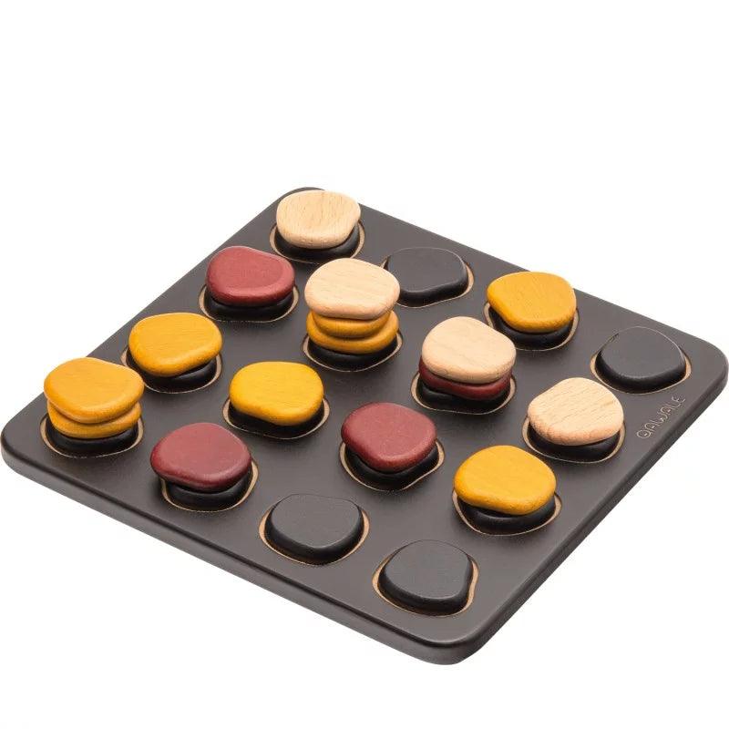 Qawale finds its inspiration in the piles of pebbles found along the roadsides. Like these traveling stones, prepare to be transported by the multiple twists and turns of this incredible game. Players take turns placing a pebble on a pile before crushing it pebble by pebble. To win the game, you will have to form a line of 4 pebbles of your color!