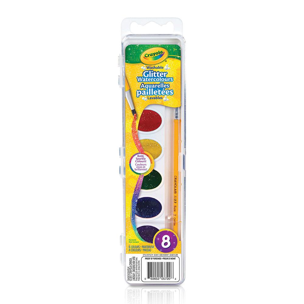 Crayola Glitter Watercolor Paint offers the same vibrant palette of hues as our regular washable watercolors, but with glitter in every color. It's easier than ever to make brilliant, colorful creations without getting messy. The eight glitter watercolors in this palette are specially formulated to wash easily off skin and most fabrics. So there's no need to worry when young artists get ready to paint their masterpieces! Crayola washable watercolor paints come in a range of bright colors that blend perfectly. Kids will love mixing and matching colors to create even more color! This set includes eight brightly-colored glitter watercolors and a brush.