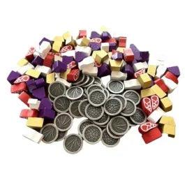 These 45 metal coins and 104 wooden resource tokens were specially designed for Wyrmspan (the game includes cardboard tokens). All metal coins are the same, and there are 26 tokens of each resource type: meat, gem, gold and milk.