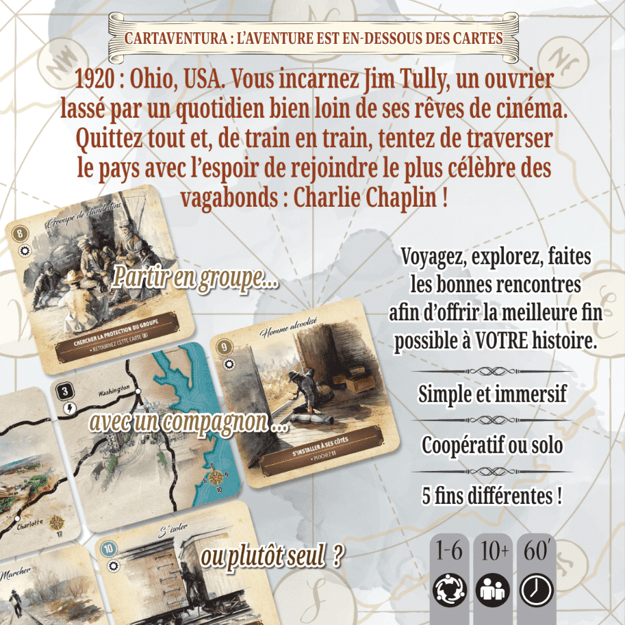 Cartaventura is a collection of narrative card games with an immersive scenario and multiple endings! Players build their adventure using cards that offer different options. Together, they work out the best choices to follow in the footsteps of the game's hero. Cartaventura offers games set in different eras, each faithfully and faithfully recreated. Players are immersed in history thanks to rich scenarios and watercolour illustrations that pay homage to travel diaries. A historical booklet, written by specialists, provides additional information. Cartaventura includes a tutorial to accompany the first game. Its simple and original gameplay system allows players to explore the scenario several times to discover all the game's secrets. With the help of what they've learned and the different choices they've made, they can optimise their adventure to discover all the possible endings.