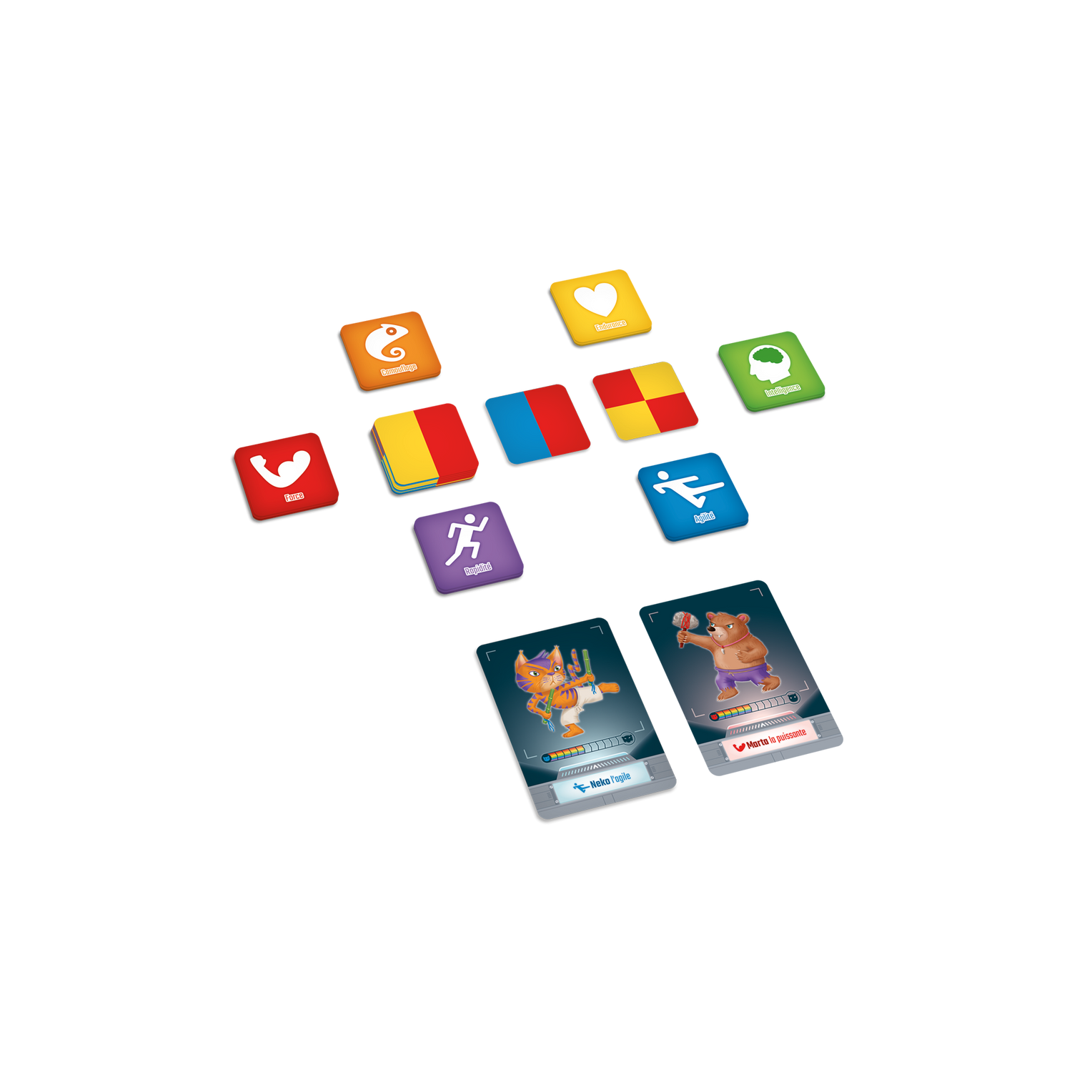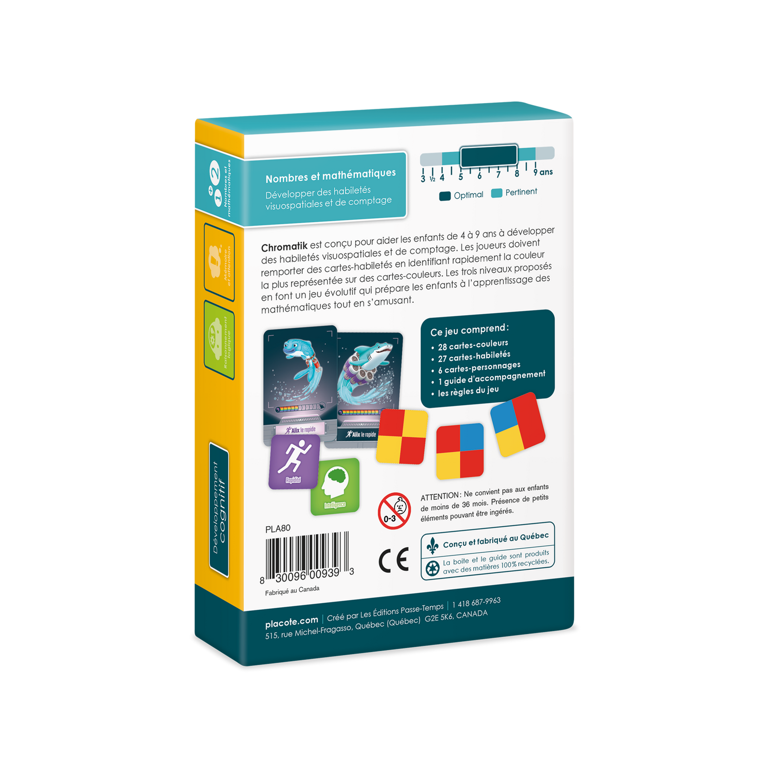 Chromatik is designed to help children aged 4 to 9 develop visuospatial and counting skills. Players must earn skill cards by quickly identifying the most represented color on color cards. The three levels of play make this an evolving game that prepares children for learning mathematics while having fun.