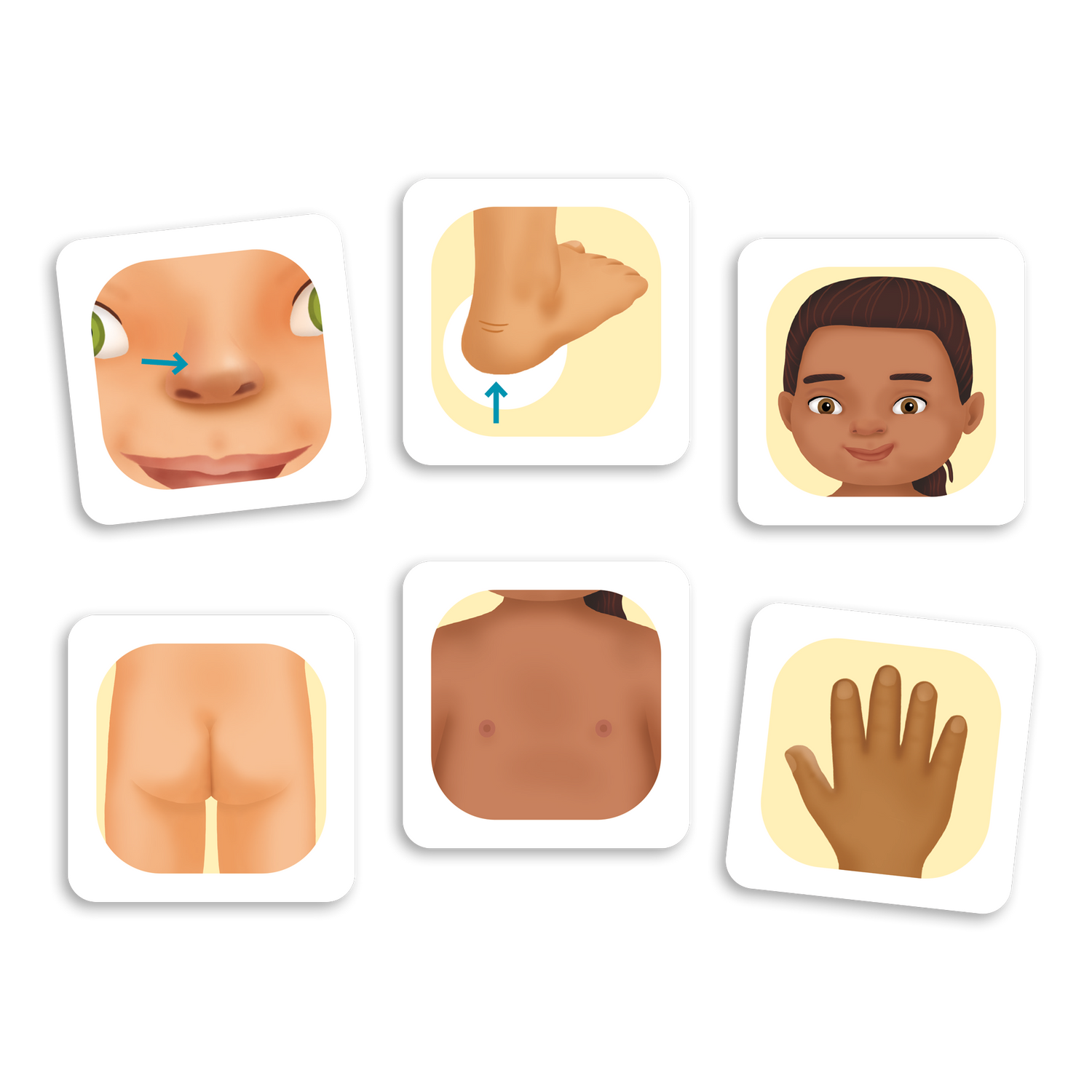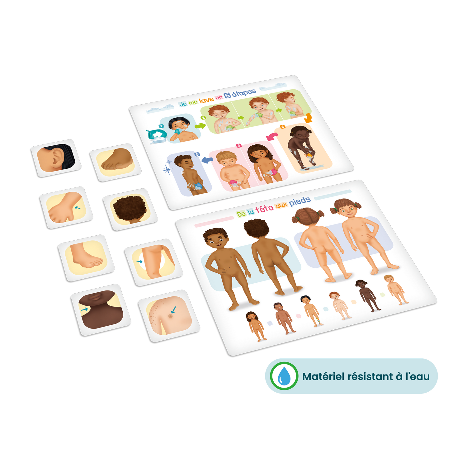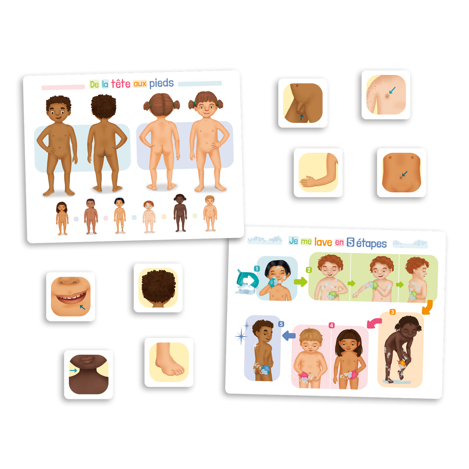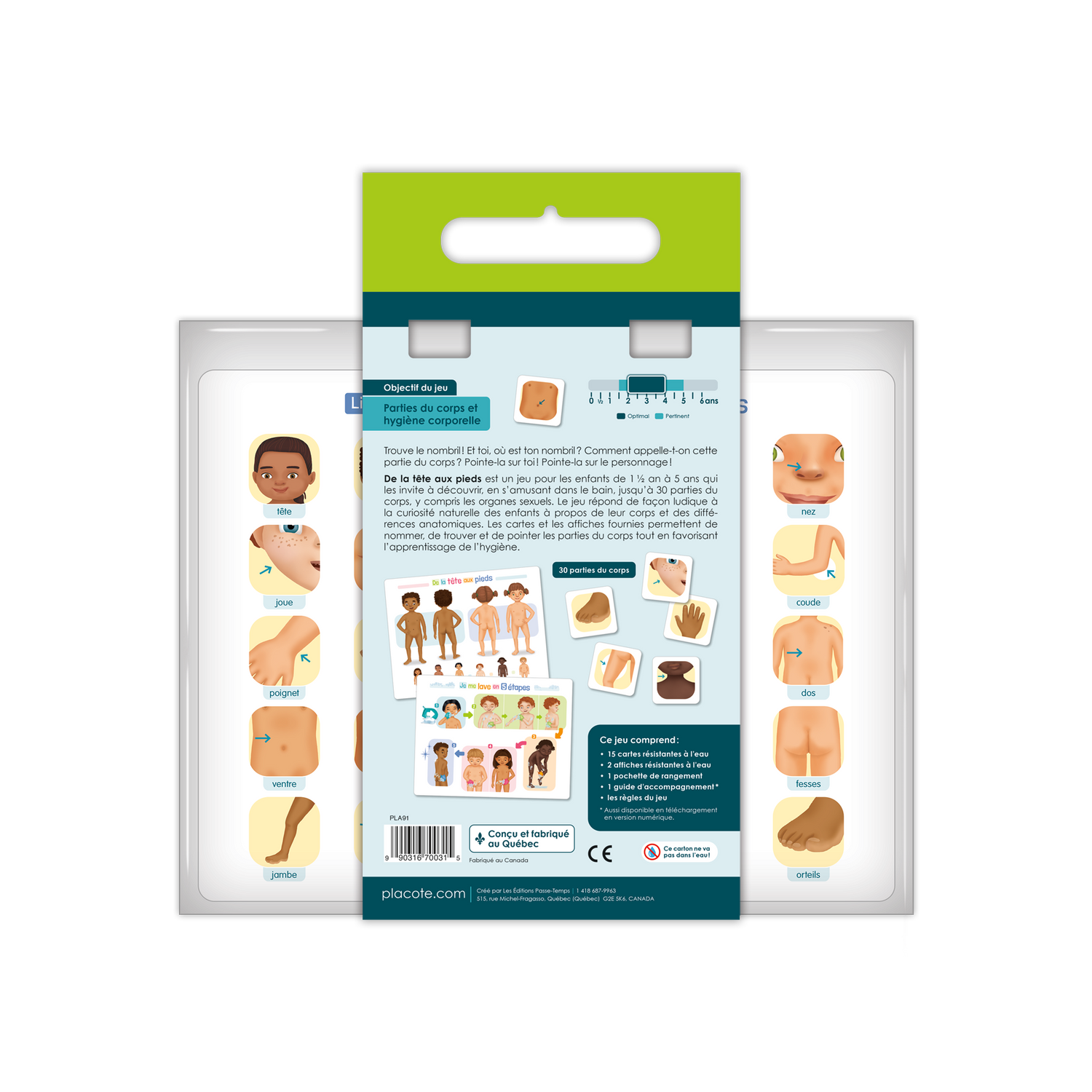 De la tête aux pieds is a game for children aged 1½ to 5 that invites them to discover up to 30 body parts, including sexual organs, while having fun in the bath. The game playfully addresses children's natural curiosity about their bodies and anatomical differences. The cards and posters provided make it easy to name, find and point out body parts, while promoting hygiene learning.