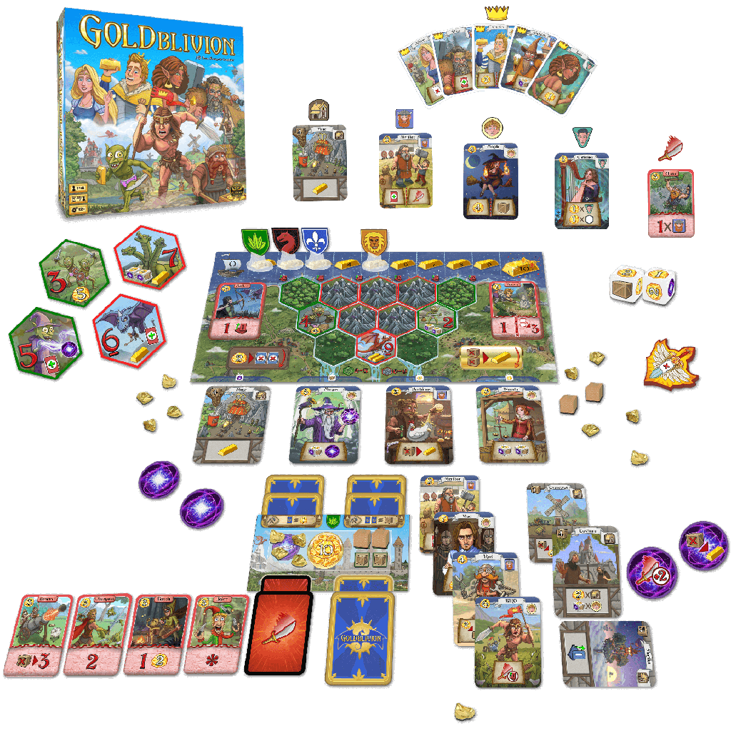 GOLDblivion is a competitive card game in which 1 to 4 players attempt to win more gold bars than their opponents. You play as the nobles of a colony who compete for wealth to become Monarch of GOLDblivion! Using a Double-Deck-Building mechanic, build your city, lead your allies and conquer new lands with your army. Take advantage of everything you can!