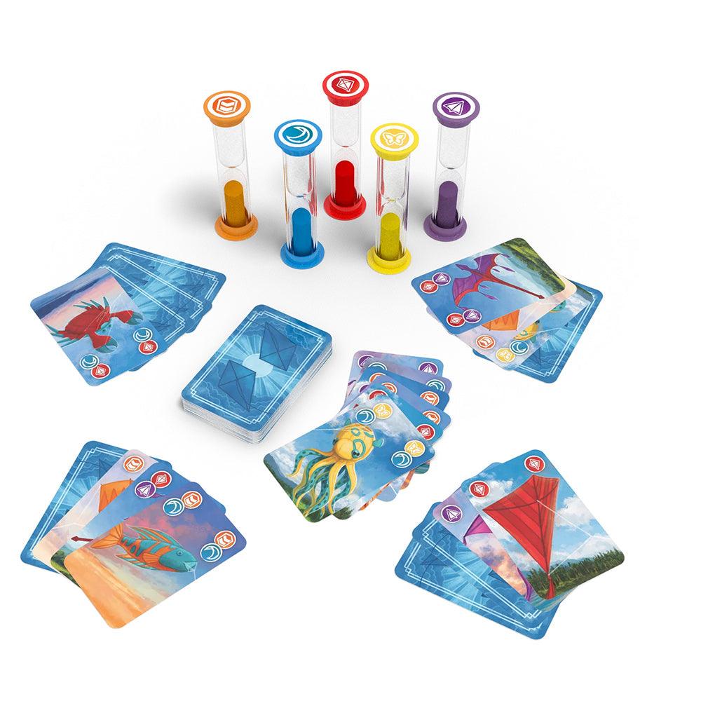 Each hourglass represents a kite, and not all are at the same height in the sky. You'll have to keep an eye on them to make sure none fall to the ground. Each card you play forces you to turn over an hourglass of the same colour.