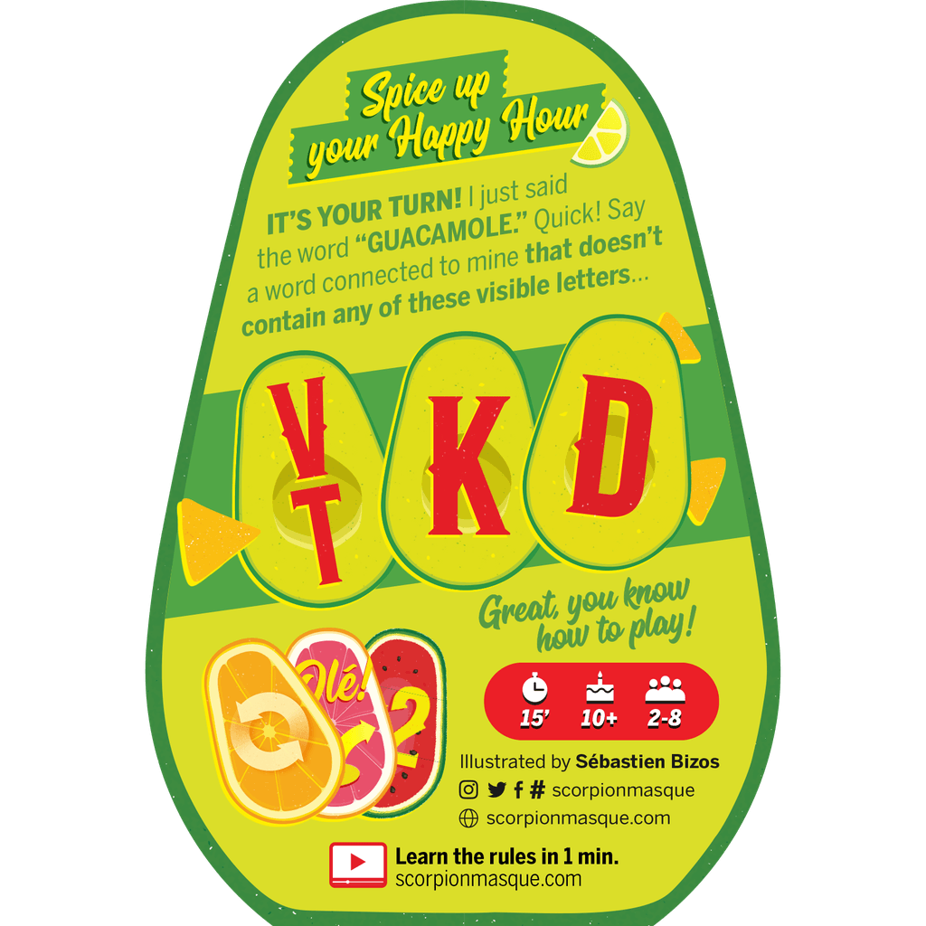 Spice up your happy hour! Eight seconds of rules for fifteen minutes of laughter! Take turns saying a word that doesn't contain any of the letters on the table... and that's related to the previous word! It's hot, because we add a letter with each turn!