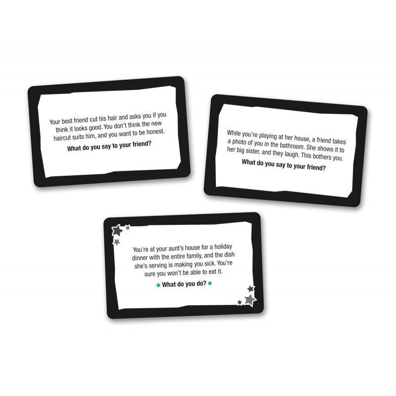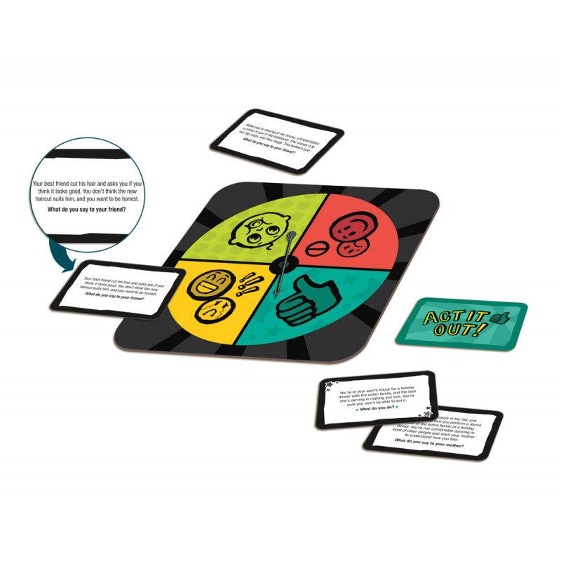 Act it out! is designed to help young people aged 8 to 14 think about the different behaviours they can adopt in situations that challenge their social skills. The roulette wheel, which invites them to improvise in an emotional, neutral, childlike or prosocial manner, helps them to push their thinking.