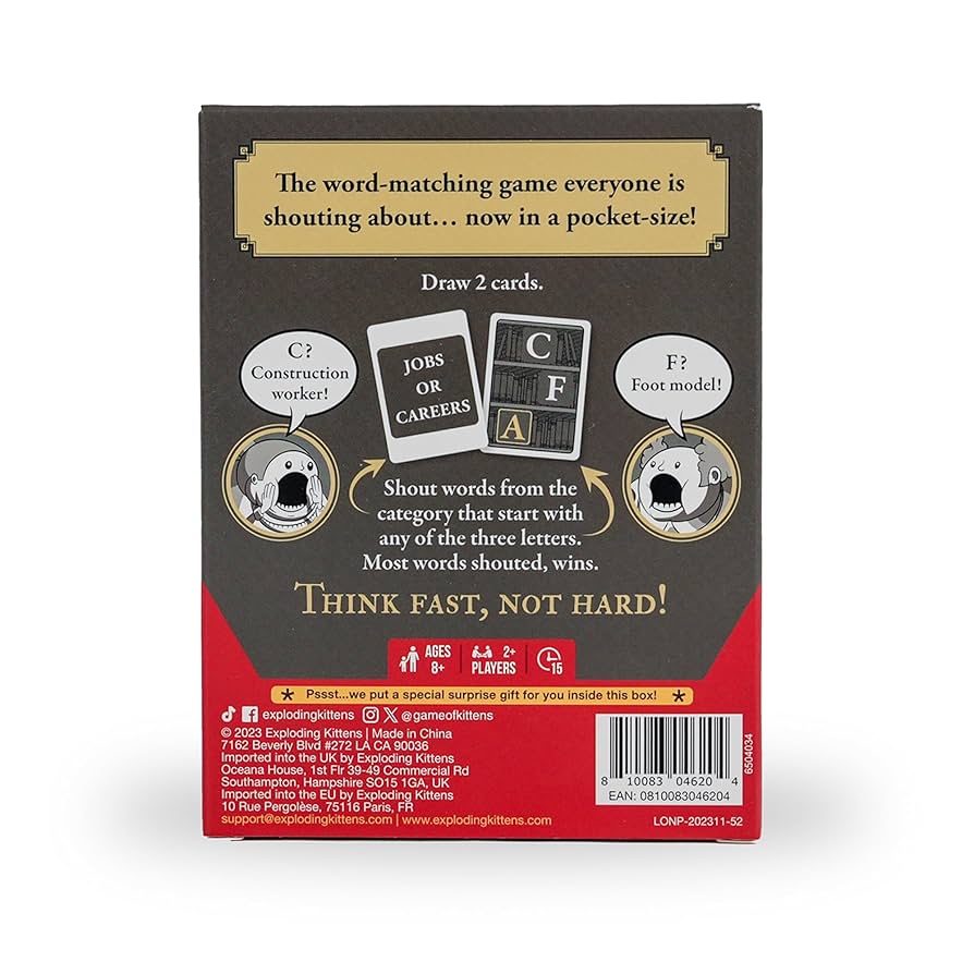 Don't let its compact size fool you: this game packs a punch! Perfectly sized for on-the-go play, the Grab & Game for really noisy librarians is the ultimate party starter. Put it in your bag and be ready to unleash an avalanche of laughter wherever you go, whether it's game night with friends or a family reunion. This version includes 35 letter cards and 20 category cards.