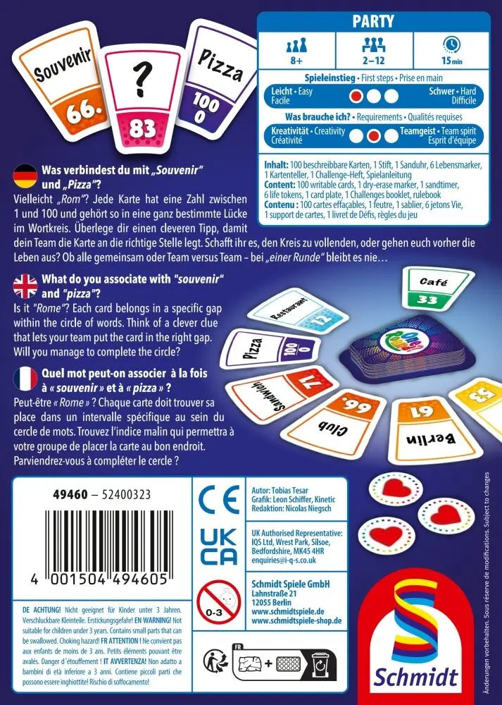 In One Round? each card must find its place in a precise interval within the word circle. Find the clever clue that will guide your team and place the card in the right spot. To win, you'll need to position 12 cards correctly.