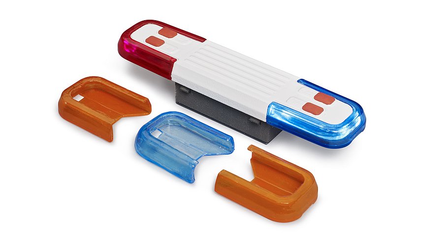 Four function keys activate an engine sound, a police siren and a fire department siren for around 20 seconds, as well as a Yelp signal. This signal is particularly useful when working in heavy traffic, and before crossing junctions, as it helps to draw attention to the blue flashing lights of emergency vehicles. The lighting function is activated while the signal is heard. Two blue caps (e.g. police), two orange caps (e.g. service vehicles) and one red cap (e.g. USA) can be combined.
