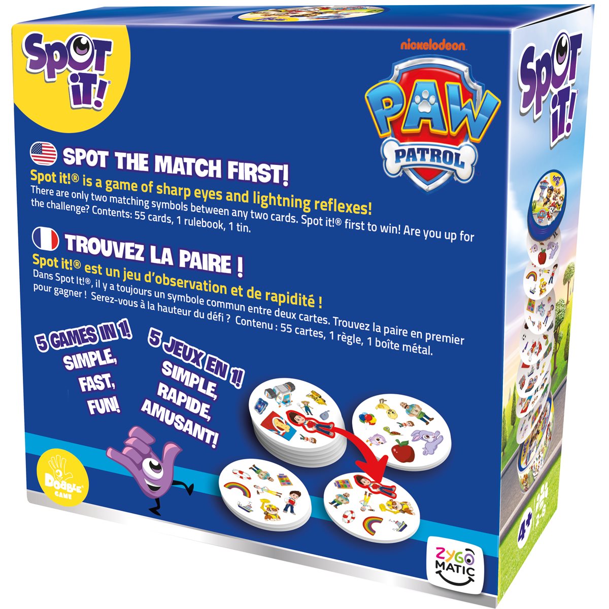 This new version of Spot it! combines characters from Paw Patrol with one of the most emblematic family games. Players try to spot the single matching symbol between 2 cards in a playful battle of speedy observation, featuring some of the most iconic characters: Marshall, Chase, Ryder, Skye and more...