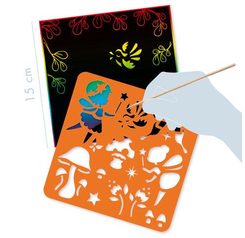 Booklet of 24 scratch-off cards with pre-printed designs. With the stencil board and wooden stylus included, everyone can let their imagination run wild!