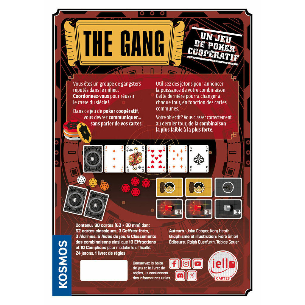 In The Gang, a cooperative version of Texas Hold'em, players bet on the strength of their hand of cards relative to the other players, then try to make their predictions come true. Players take on the role of seasoned gangsters who join forces to pull off a daring heist of three safes reputed to be unbreakable. Strategy, communication and team spirit are essential to the success of this legendary heist.