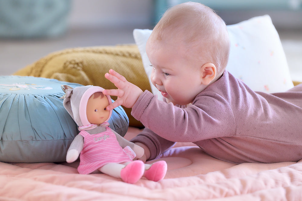 Perfect for accompanying baby everywhere, Miss Rayée Rêves d'Étoiles is the little doll that will never be forgotten. She's perfectly sized (25 cm high) for little hands to grasp and hold by her stocking, hat, arms, legs and even her dress. She's made from an ultra-soft fabric that makes her very cuddly. Her soft, realistic vinyl face charms and comforts baby and is delicately scented with Corolle's signature vanilla. A plus for parents: Miss Rayée Rêves d'Étoiles comes with a sewn-in label on which to write baby's first name or a telephone number in case the doll gets lost.