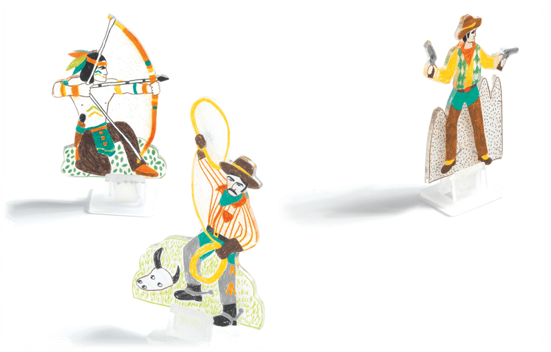 Using coloured pencils, you transfer the models onto the plastic and then cut them out. After a few minutes in the oven, the plastic shrinks by about 7 times and the colours come out vibrant!
