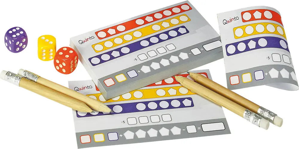 In QWINTO, all throws benefit all players, but each uses them in his or her own way to complete his or her own scorecard. In turn, one of the players rolls one, two or three dice. Everyone can then enter the total obtained in a row whose color is identical to that of one of the dice thrown. But there are two golden rules: the numbers in the rows must be in ascending order of value from left to right. And no number may appear twice: neither in the rows, nor in the columns! Once a player has completed two rows, the game ends and the points are counted.