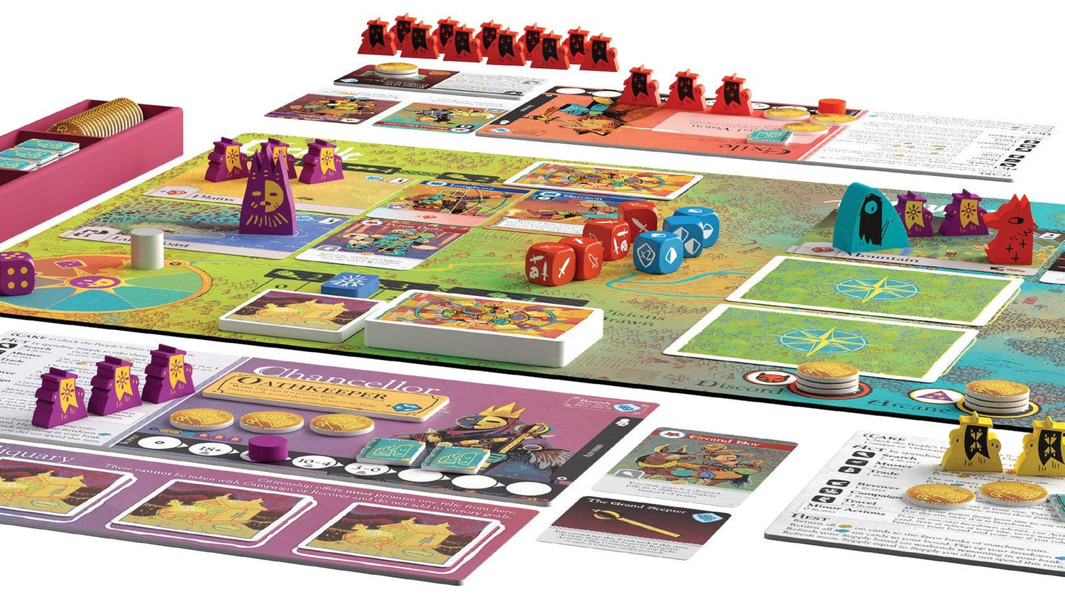 In Oath, one to six players guide the course of history in an ancient land. Players can take on the role of agents strengthening the old order or the plan to ruin the kingdom. The consequences of one game will ripple through those that follow, changing the resources and actions that future players may have at their disposal and even altering the game's basic victory condition.