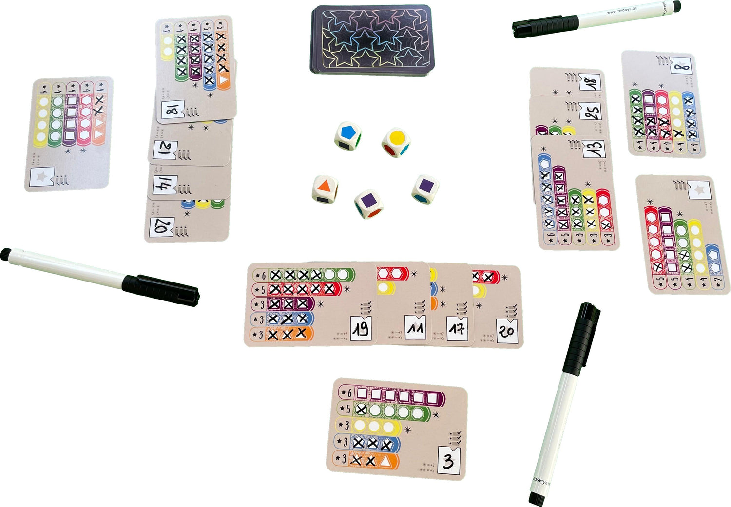A player rolls the dice 3 times and each player decides if he wants to record the roll on one of his boards. Quickly finish your boards in a simple way, Or fill in as many as possible to be funky, Even try a super funky with a perfect board!