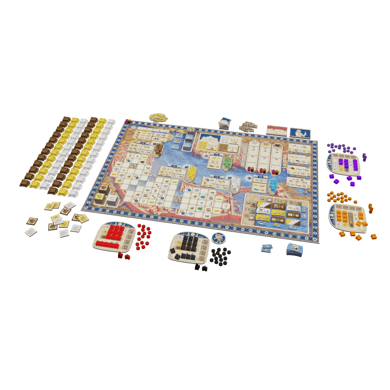 Through various actions, you can expand your influence in different districts by enlarging construction sites and transforming them into buildings to score valuable victory points. But you will also exert your influence in the temple district to gain the favor of the king. In the port district, you can obtain ships with significant abilities and score victory points.