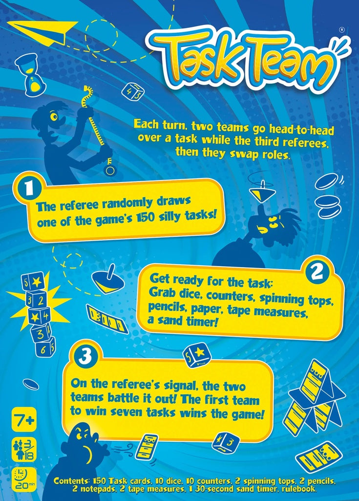 The first team to win seven task cards is declared the winner!