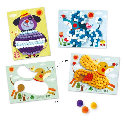3 dogs to decorate by sticking colorful pompoms.