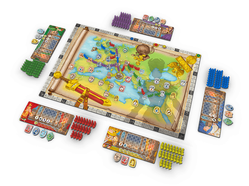 In Caesar's Empire, you'll have to build roads to connect Rome to the other cities shown on the map. You'll earn points every time you build a Road. Each new city you connect to Rome allows you to collect City tokens and Wealth tokens, which will earn you extra points at the end of the game. The game ends when Rome is connected to all the cities on the board. All the players must then add up their points from the City tokens and Wealth tokens to the points they have earned during the game. The player with the most points wins!