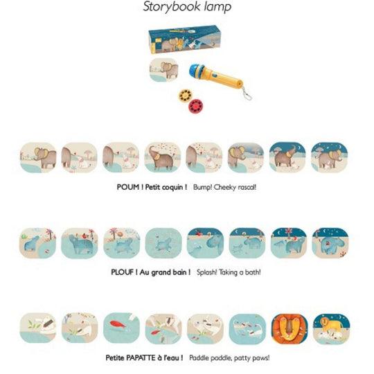 Flashlight in hand, shine the wonderful images on the wall to tell a series of colourful stories: POUM! Little rascal; PLOUF! Au grand bain; Petite PAPATTE à l'eau!