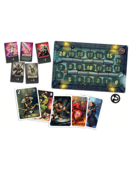 Turn by turn, reduce your equipment or add monsters to face behind the door. But only one of you will be able to enter! Will you manage to cross the dungeon alive, or will you let your opponents brave the danger, hoping they never come out?