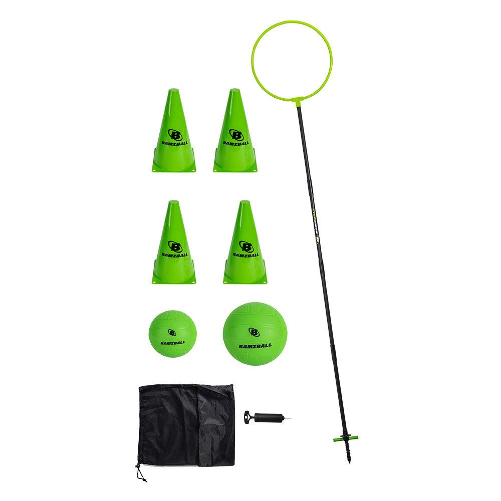 Includes 21″ diameter ring on an adjustable 72″ pole, ground stake, 2 inflatable balls (4″ and 7″ diameter), 4 boundary cones, air pump, and rule book.