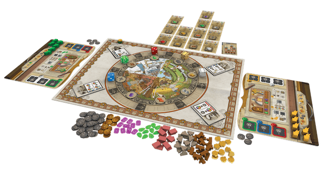 To win, players must earn more prestige points than their opponents by actively participating in the construction of the Cathedral, element by element. To do this, they must collect resources, reserve plans and build parts of the cathedral.