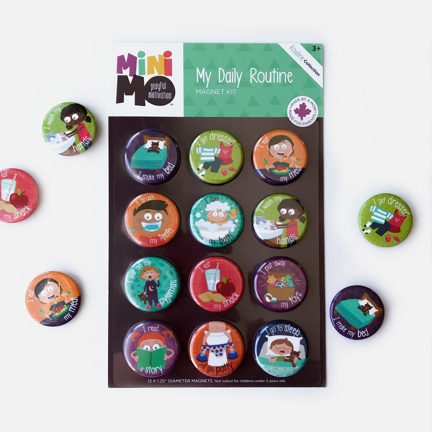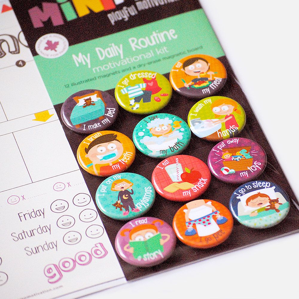 The My Daily Routine magnet set includes the same 12 colorful, easy-to-handle magnets found in the Motivation Set. The little magnets, embellished with endearing illustrations, are sure to make evening and morning routines much more fun for the whole family. Use them in the order that suits your household, get your mini involved and let him slide the magnet away with pride when the task is done!