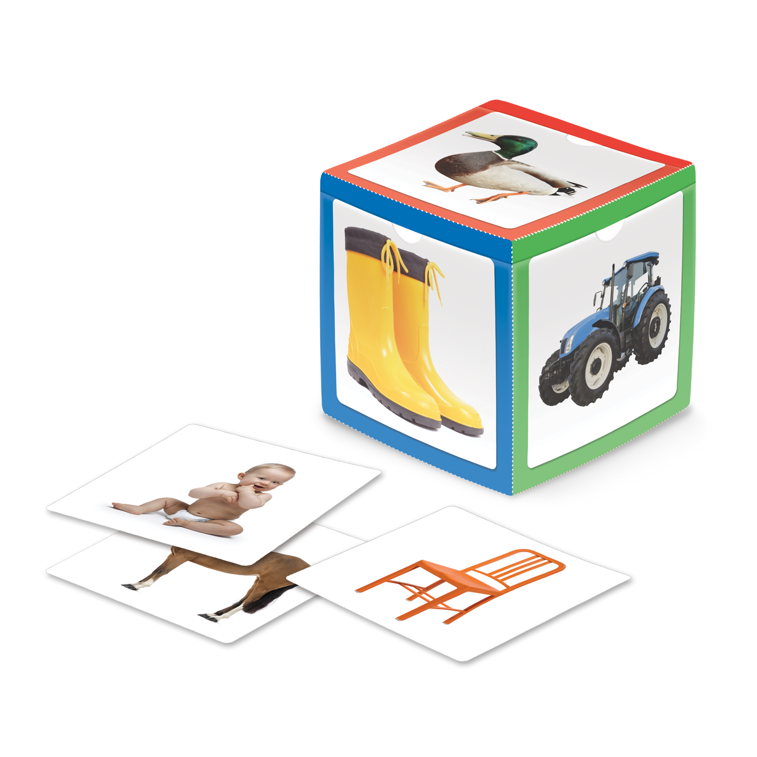 My First Words is designed to help children aged 6 months and up make familiar sounds and kids over 1 grow their vocabulary. Just place the photo cards in the clear pockets on each side of the die. The images represent common nouns : the typical first words young children learn.