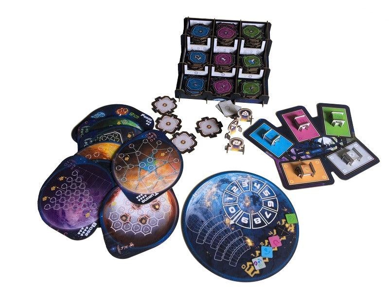 The Confederations have therefore embarked on the construction of their own bases in orbit, equipped with space portals. The leaders of the Confederations use their influence in the Odyssey command station to send as many of their colonists as possible to these Exoplanets. You will play the role of the leader of one of these Confederations. You'll have to organise the work of your engineers in the Odyssey command station, supervise the layout of the new modules in your space base and, above all, manage the flow of colonists to your base and then on to the Exoplanets.