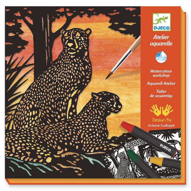 Discover Djeco's backlit watercolor, a creative set for children aged 6 and up, featuring 4 paintings to be painted on the theme of wild animals including leopards, a crocodile, a tiger, and a toucan.