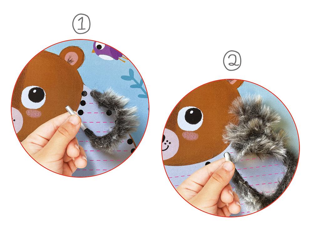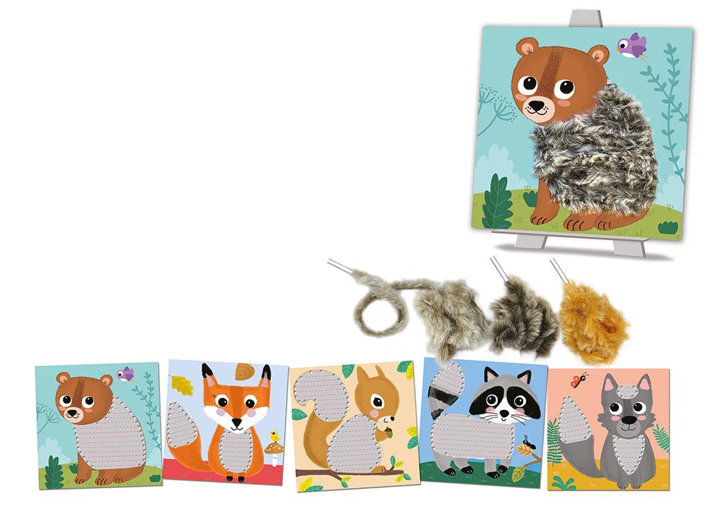 Dress the animals in beautiful fur by lacing the wool through the holes. Once the paintings are finished, you can display them on the pretty easel included.