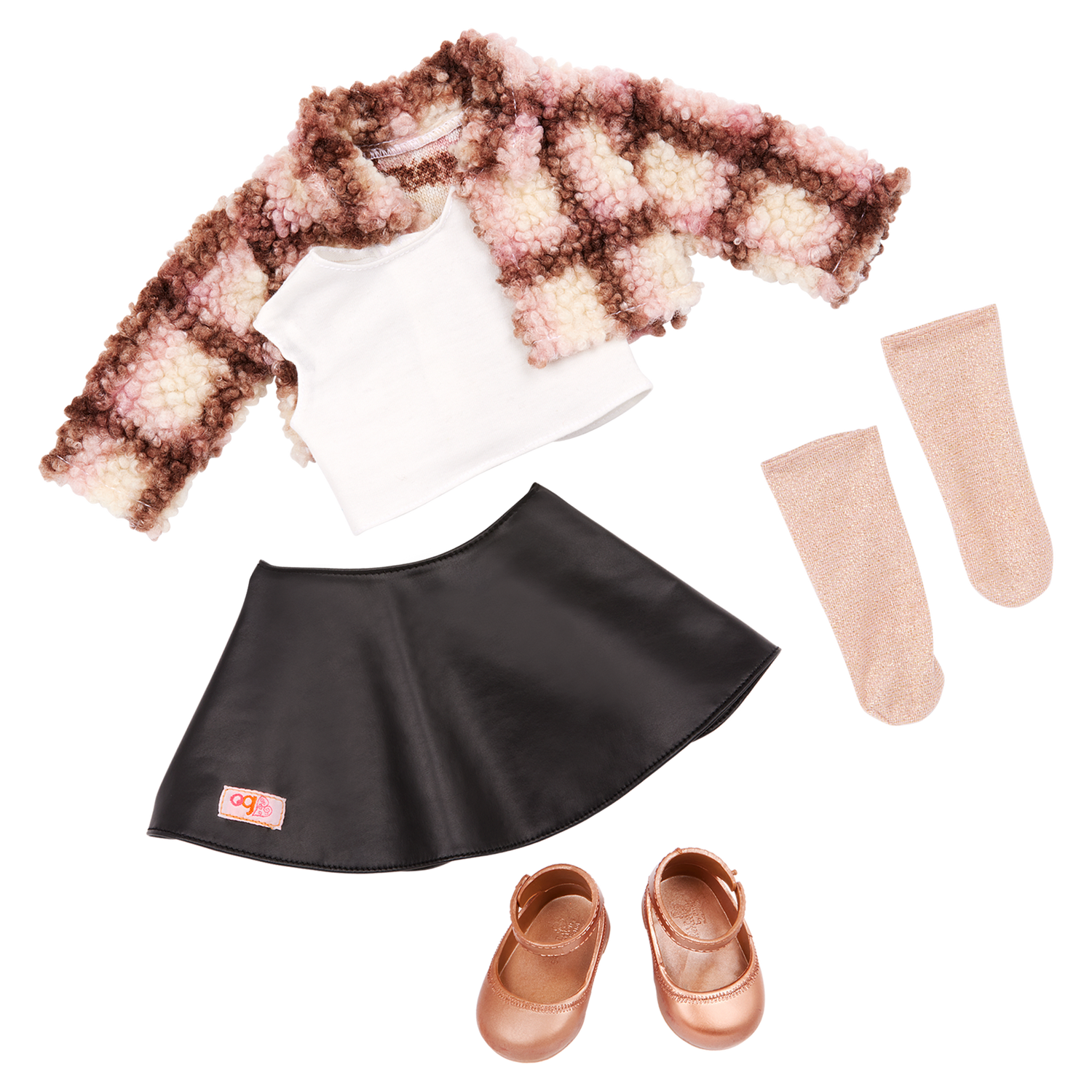 - 1 non-articulated 46 cm (18-inch) doll, 1 jacket, 1 top, 1 skirt, 1 pair of underwear, 1 pair of socks, and 1 pair of boots