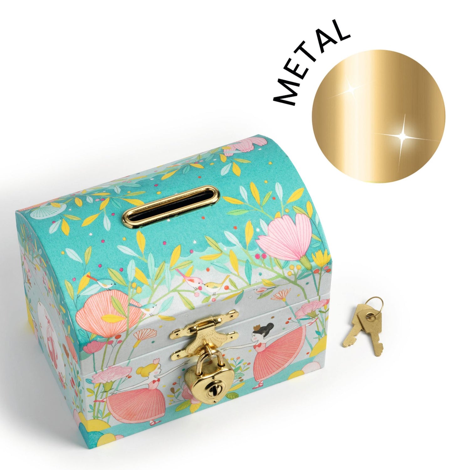 Discover this superb piggy bank which can also be used as a treasure chest. A pretty decorative object, with its bucolic illustrations of ballerinas, which will find its place in the bedroom. Closed with a padlock, the piggy bank comes with 2 keys so you can collect your savings.