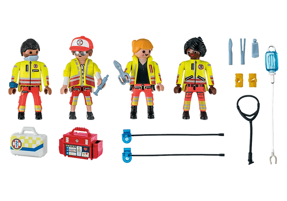 This pack contains four characters dressed in first-aid outfits, plus various medical instruments such as a defibrillator, a bag and a first-aid kit.