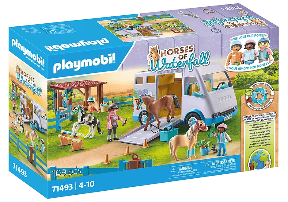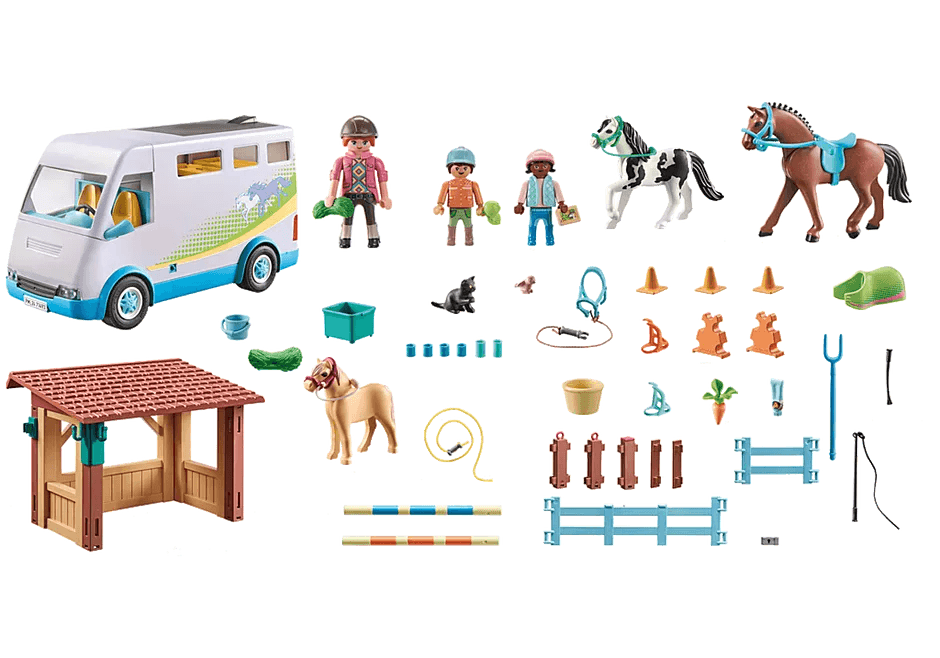 This set includes three PLAYMOBIL characters, riding instructor Joana and two children, a horse, two ponies, a horse carrier, a horse blanket, a halter, a saddle and other great riding equipment.