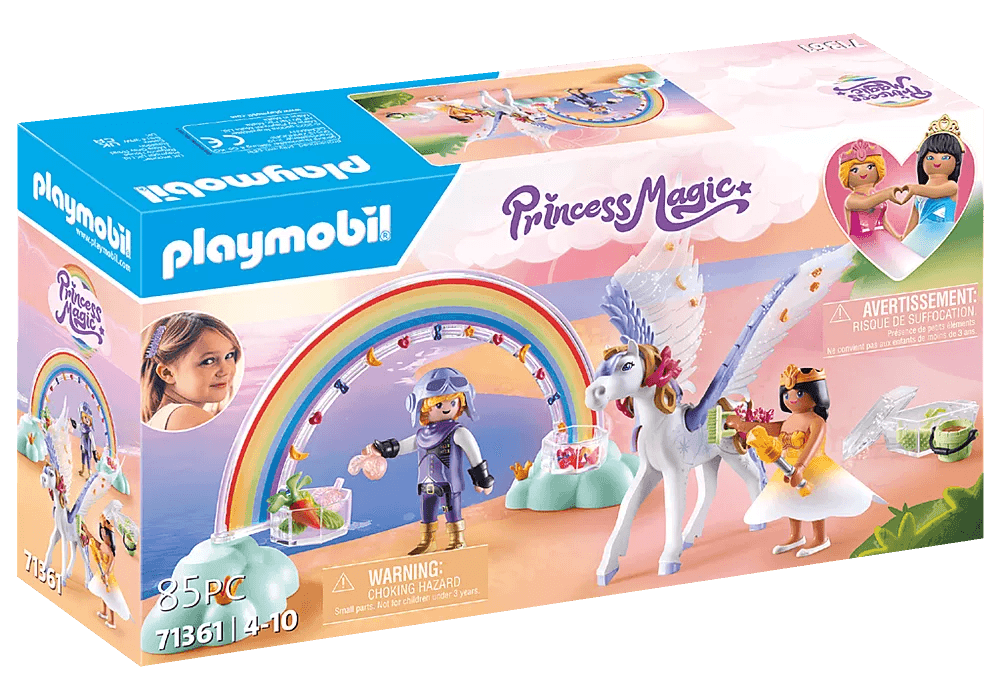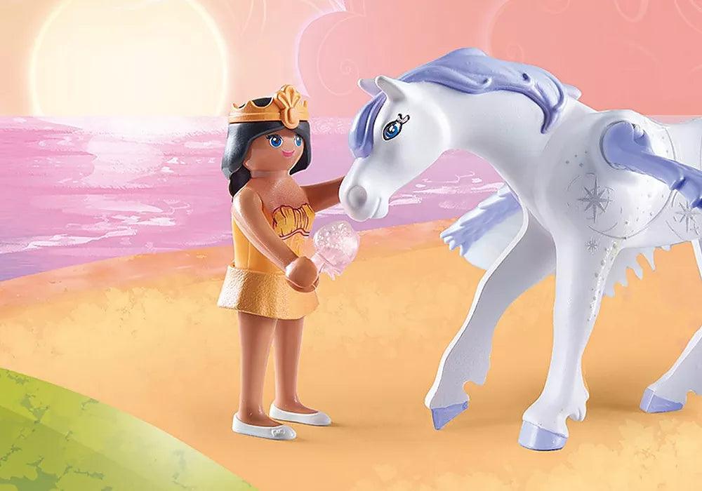 - Charmingly designed play figure set featuring two PLAYMOBIL characters, the prince and princess, a toy pegasus with posable wings, a rainbow, lots of jewelry accessories and lots of extras for imaginative role play