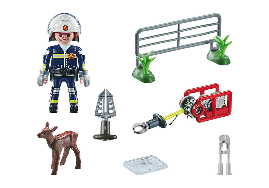 Emergency call to the fire station! Includes a figure, a fawn caught in a fence, a support plate, a rescue shear and the spreader.